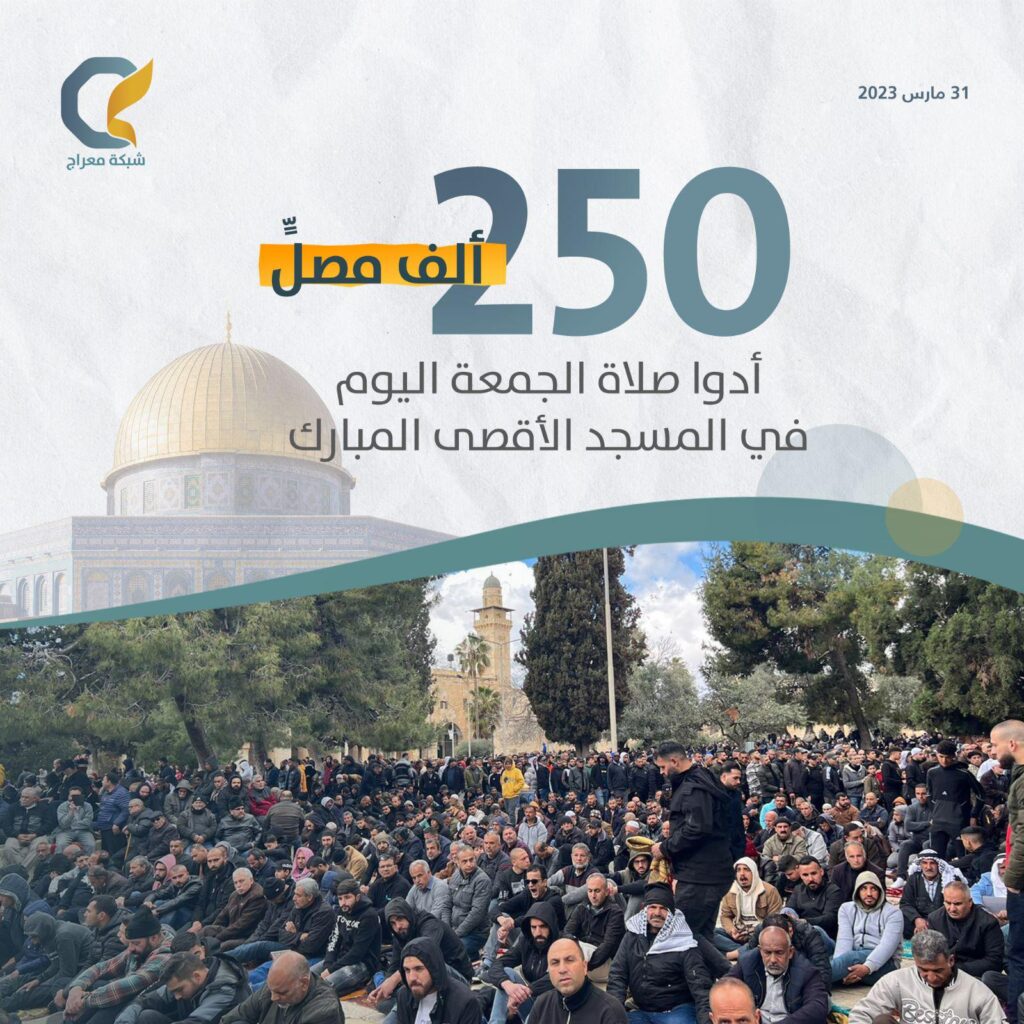 وذكرت دائرة الأوقاف الاسلامية بالقدس أن 250 ألف مصل أدوا صلاة ظهر اليوم الجمعة بالمسجد الأقصى المبارك.