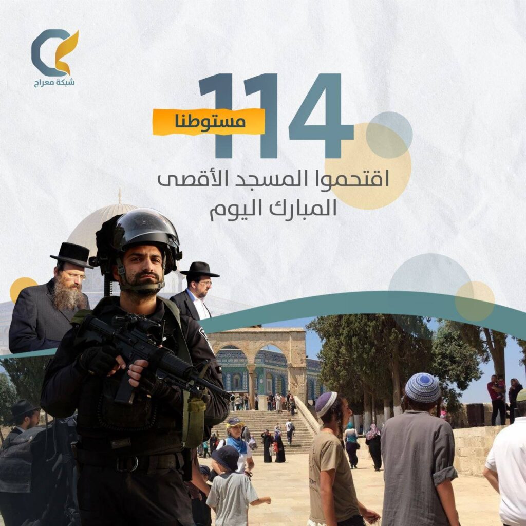 دائرة الأوقاف الإسلامية في القدس المحتلة أشارت إلى أن 114 مستوطنا اقتحموا الأقصى منذ صباح اليوم، ونفذوا جولات استفزازية في باحاته، وأدوا طقوسًا تلمودية في منطقة باب الرحمة شرقي المسجد.