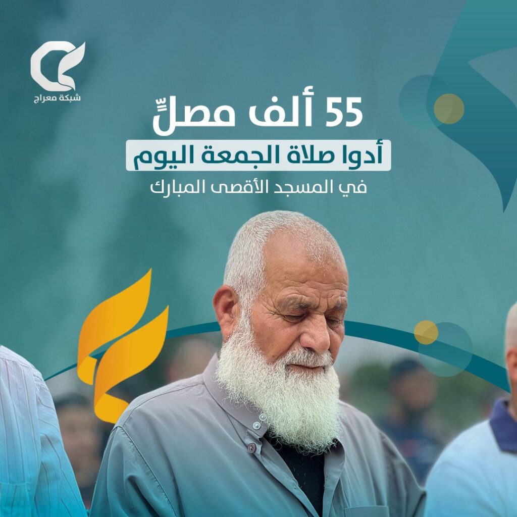 وأفادت دائرة الأوقاف الاسلامية بالقدس بأن 55 ألف مصل أدوا صلاة الجمعة بالمسجد الأقصى المبارك.