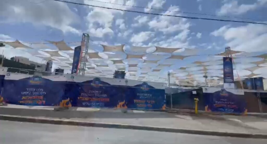 وجهز العاملون الأعمدة الحديدية والمنصة والمدرجات على أرض تبلغ مساحتها نحو 8 دونمات بالحي، وسقفوها بالشوادر البلاستيكية، وعلقوا عشرات الإعلانات الخاصة “بعيد الشعلة” اليهودي وأعلام كيان الاحتلال وغيرها.