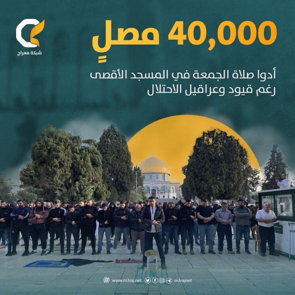 وأفادت دائرة أوقاف القدس، أن نحو 40 ألف مصلٍّ، أدوا اليوم صلاة الجمعة في المسجد الأقصى المبارك.