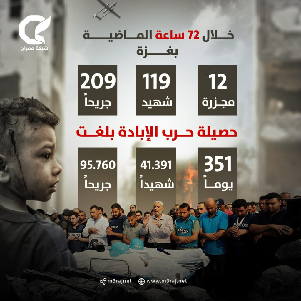 أفادت وزارة الصحة الفلسطينية في غزة، بارتكاب الاحتلال الإسرائيلي 12 مجزرة ضد العائلات في القطاع ، وصل منها للمستشفيات 119 شهيدًا و209 إصابات خلال الـ72ساعة الماضية.