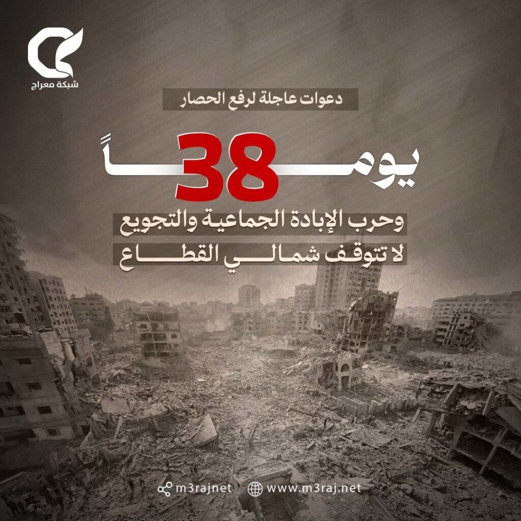 يواصل الاحتلال “الإسرائيلي” حرب الإبادة والتجويع والحصار المطبق على شمالي قطاع غزة، ومنع إدخال الغذاء والدواء والمياه لآلاف المواطنين المحاصرين هناك، لليوم الثامن والثلاثين على التوالي.