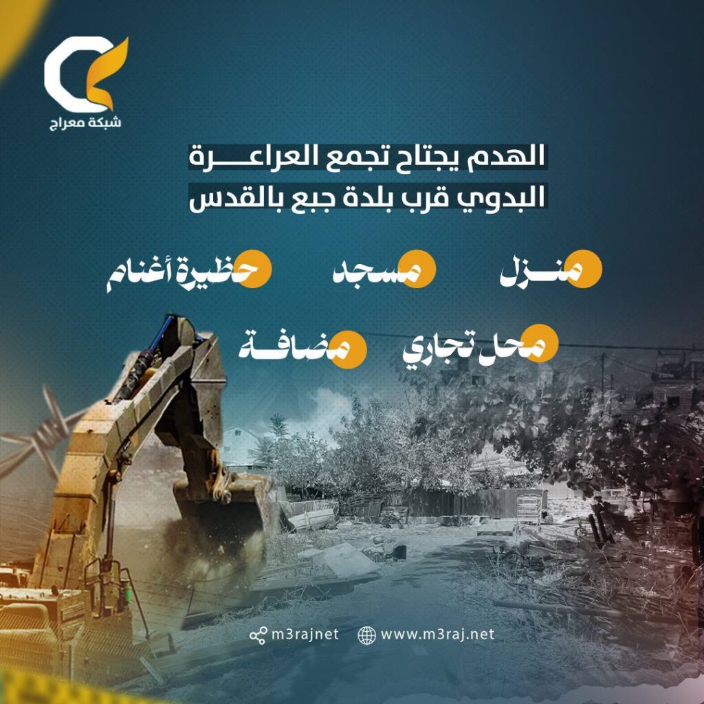 وأفادت مصادر محلية بأن جرافات الاحتلال هدمت منزلاً ومسجداً ومحلاً تجارياً ومضافة وحظيرة أغنام في التجمع البدوي.