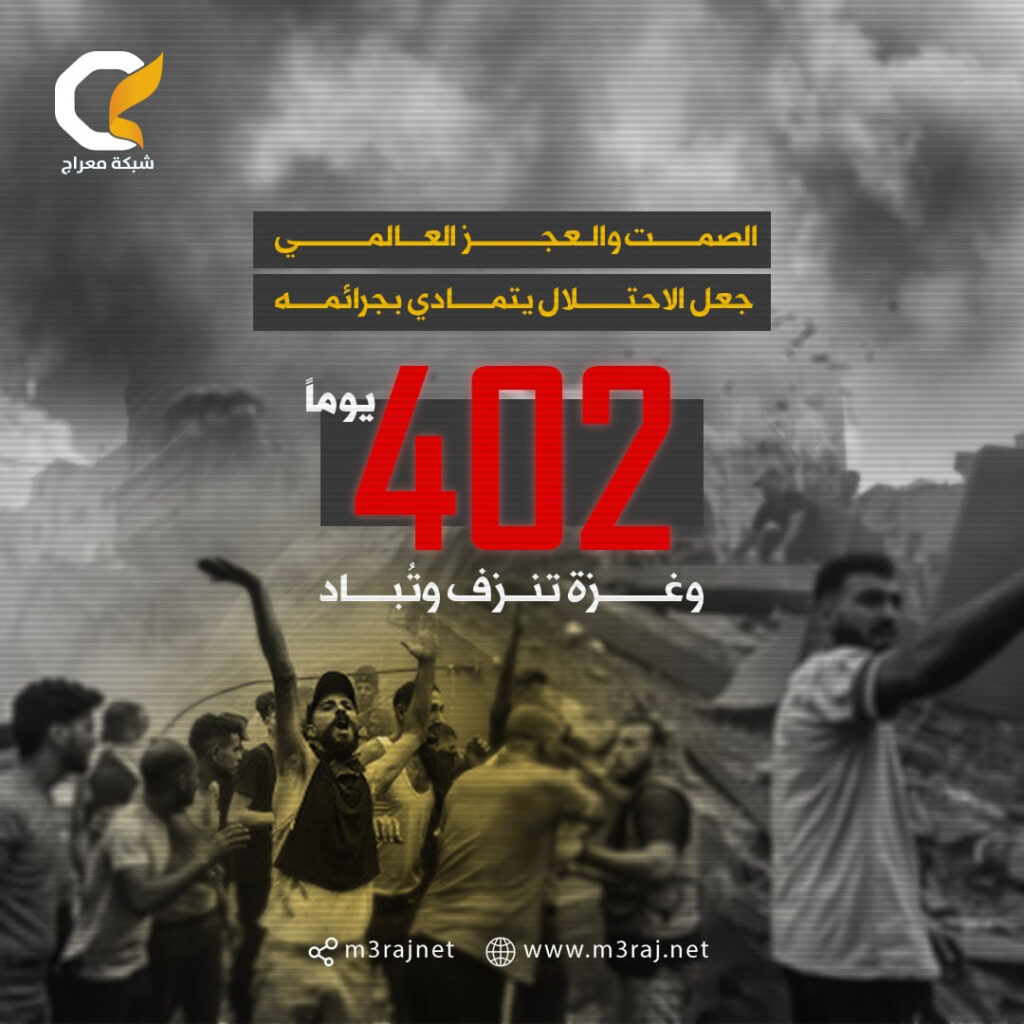 يتعرض قطاع غزة لحرب إبادة جماعية مستمرة منذ 402 يوم على يد قوات الاحتلال الإسرائيلي، وسط صمت وعجز عالمي مريب.