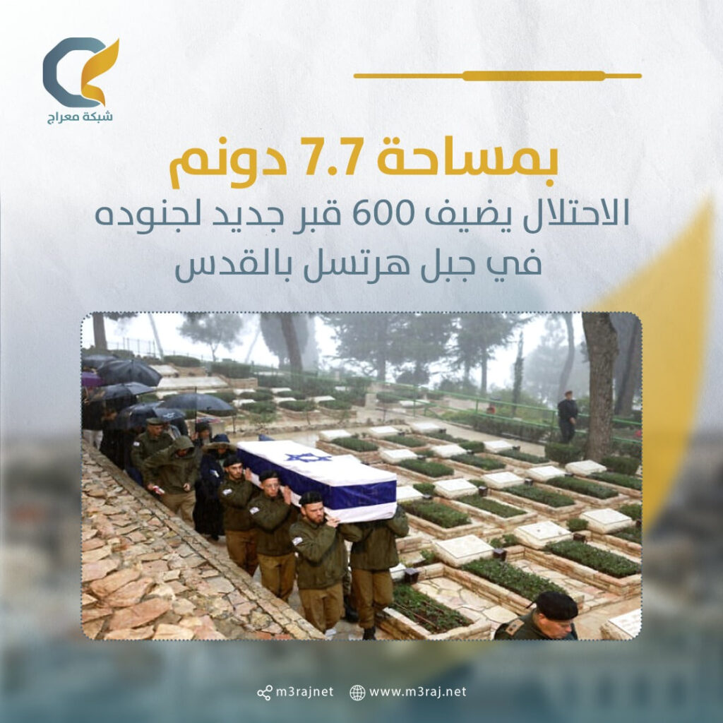 أعلن جيش الاحتلال “الإسرائيلي” عن تخصيص مساحة 7.7 دونمات في جبل “هرتسل” بالقدس المحتلة لصالح وزارة الدفاع، بهدف إضافة 600 قبر جديد في المقبرة العسكرية.