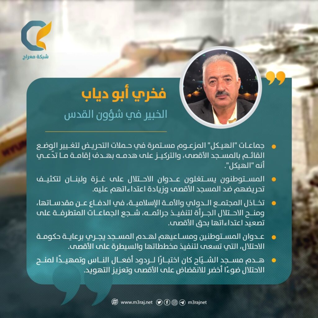 قال عضو هيئة رابطة أمناء الأقصى فخري أبو دياب جماعات الهيكل المتطرفة تقوم بمزيد من التحريض المتواصل لتسريع تغيير الوضع القائم في المسجد وهدمه أو على الأقل جزء منه والشروع بإقامة الهيكل المزعوم.