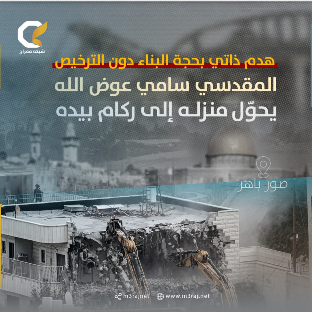 أجبرت بلدية الاحتلال “الإسرائيلي” المقدسي سامي عوض الله “أبو زيد” على هدم منزله ذاتياً في بلدة صورباهر بالقدس المحتلة، بحجة البناء دون ترخيص.