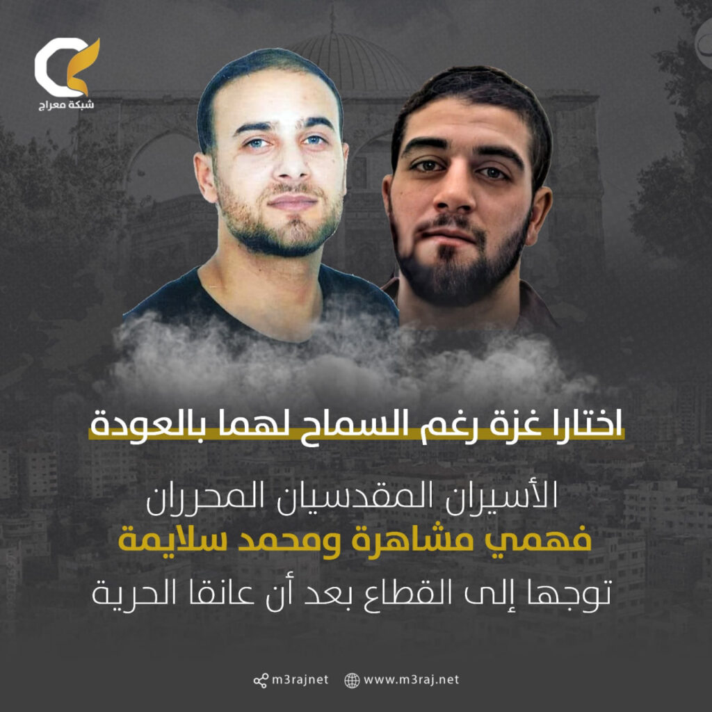 أفرج اليوم السبت عن الأسيرين المقدسيين المحررين “فهمي مشاهرة” و”محمد السلايمة” في إطار صفقة التبادل “طوفان الأحرار”، حيث اختارا التوجه إلى قطاع غزة رغم السماح لهما بالعودة إلى القدس المحتلة.