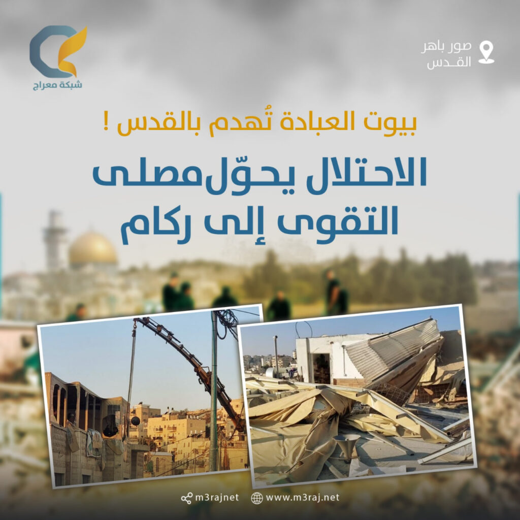 هدمت آليات الاحتلال “الإسرائيلي” اليوم الأربعاء، مصلى التقوى في بلدة صور باهر جنوبي القدس المحتلة، بحجة البناء دون ترخيص.