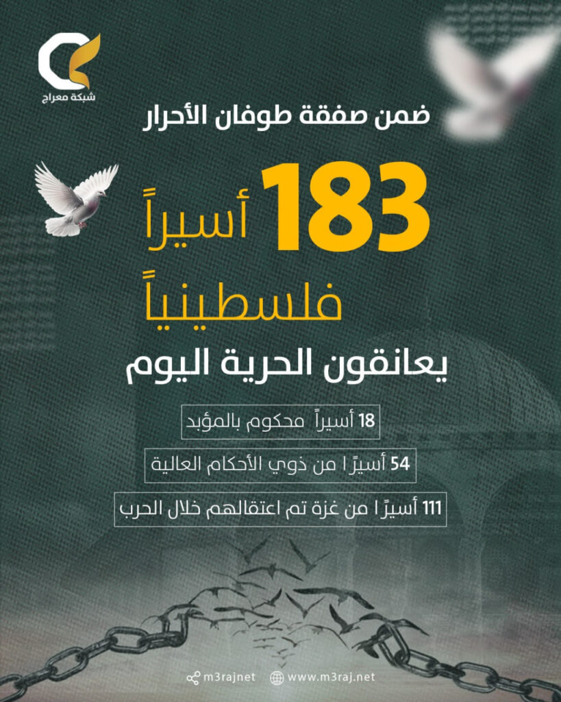أعلن مكتب إعلام الأسرى عن إطلاق سراح 183 أسيرًا فلسطينيًا اليوم السبت، من سجون الاحتلال الإسرائيلي ضمن الدفعة الخامسة من صفقة “طوفان الأحرار”.