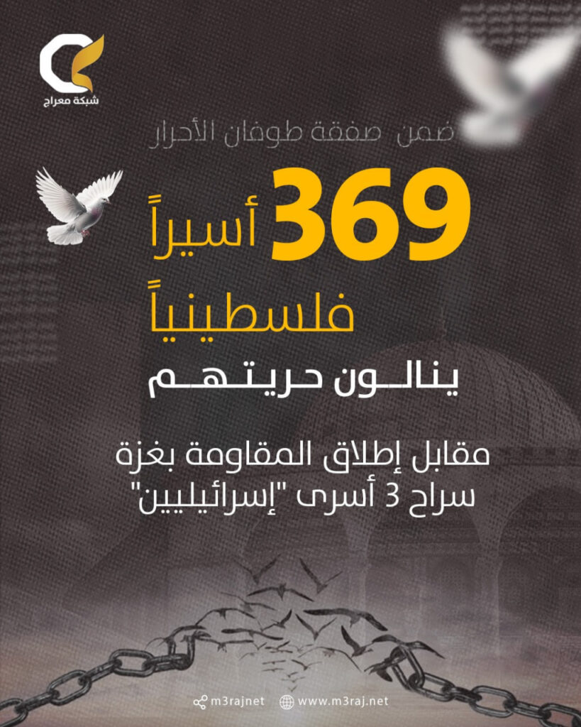 ويأتي هذا الإفراج بعد تسليم المقاومة في غزة ثلاثة أسرى “إسرائيليين”، حيث سيتم إطلاق سراح 36 أسيرًا محكومًا بالسجن المؤبد، إضافة إلى 333 أسيرًا من قطاع غزة، الذين اعتقلوا خلال حرب الإبادة الجماعية.