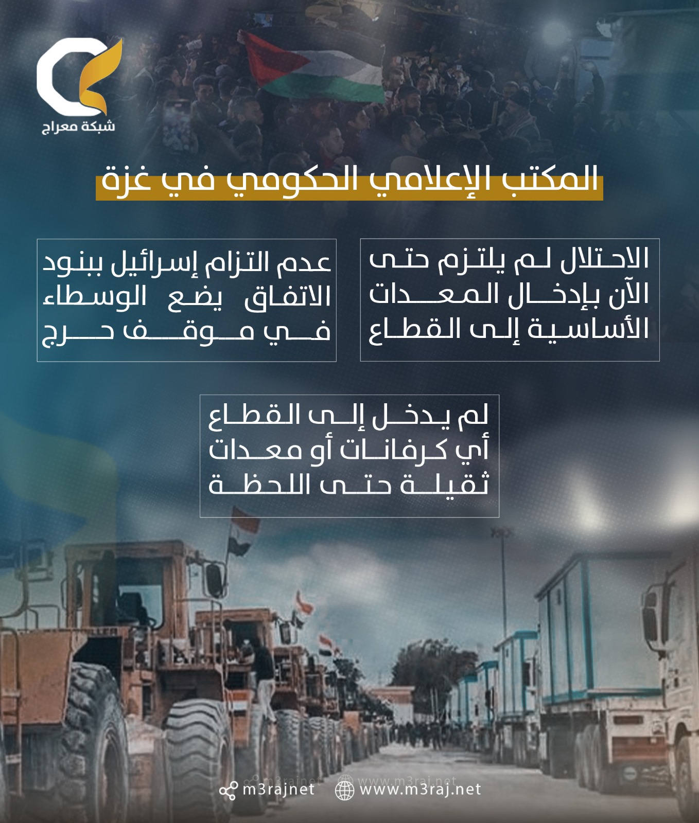 أكد المكتب الإعلامي الحكومي في غزة أن الاحتلال “الإسرائيلي” لم يلتزم حتى الآن بإدخال المعدات الأساسية إلى القطاع، رغم الاتفاقات المبرمة بشأن ذلك.
