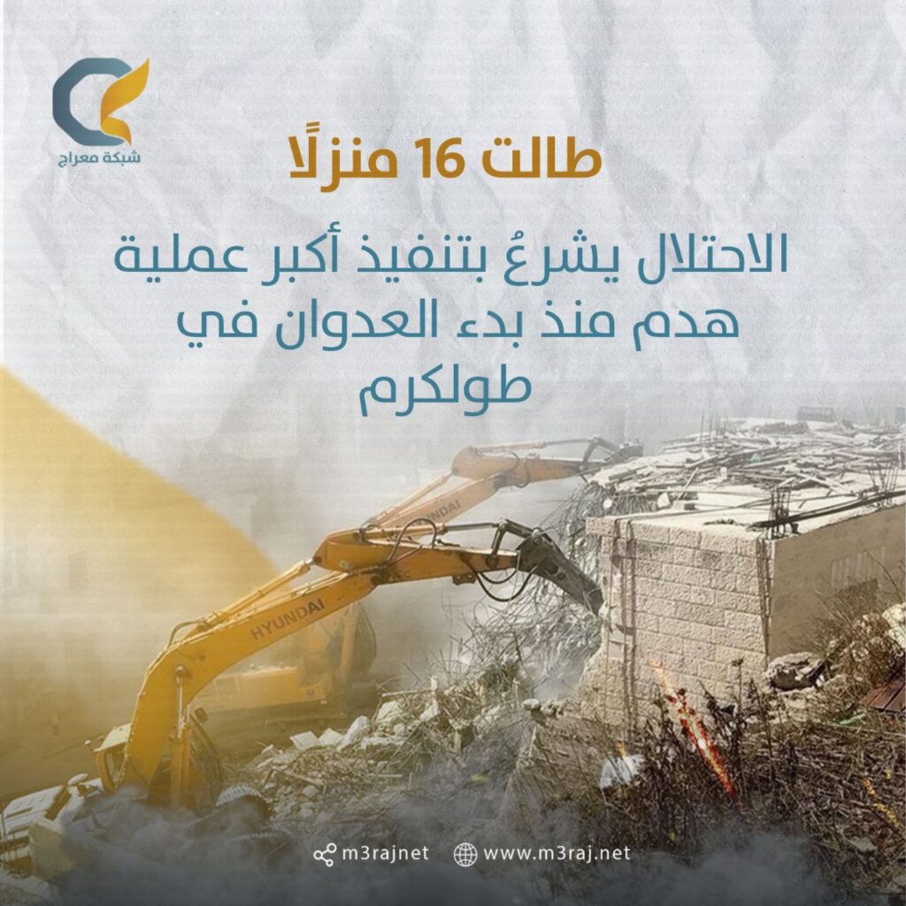 حيث بدأت آليات الاحتلال اليوم الثلاثاء بتدمير 16 منزلًا في مخيم طولكرم.