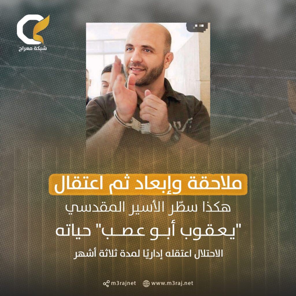 أصدرت سلطات الاحتلال “الإسرائيلي” قرارًا بتحويل الأسير المقدسي يعقوب أبو عصب إلى الاعتقال الإداري لمدة ثلاثة أشهر، وذلك عقب اعتقاله يوم الإثنين الماضي.