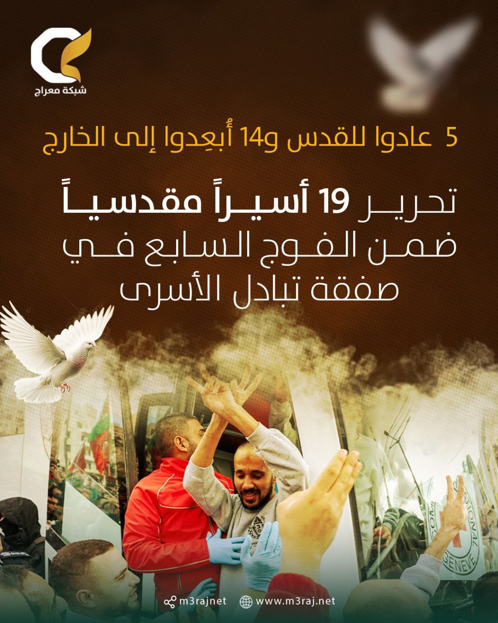 وضمّت قائمة المحررين 14 أسيرًا محكومًا بالسجن المؤبد، حيث أبعد الاحتلال 14 منهم إلى خارج فلسطين، بينما عاد خمسة أسرى إلى منازلهم في القدس، وهم: أحمد نصلة من مخيم شعفاط، محمد عباد من رأس العمود، خالد الحلبي، عاهد النتشة، وحمزة الكالوتي من بيت حنينا.