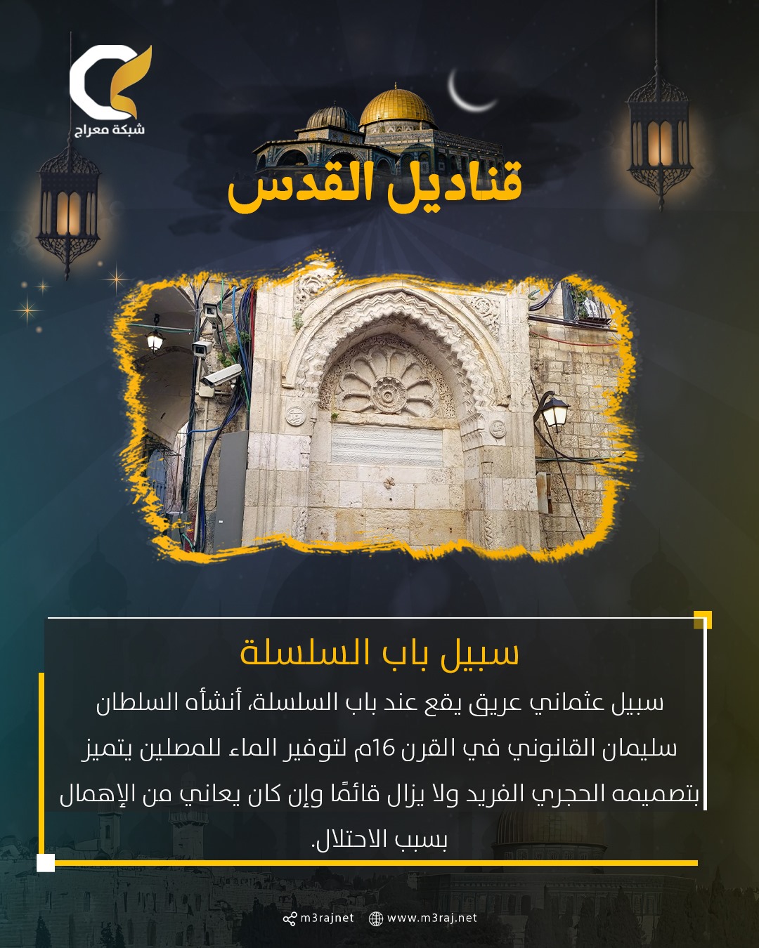 يُعد سبيل باب السلسلة واحدًا من الأسبلة التاريخية البارزة داخل المسجد الأقصى المبارك، ويقع بالقرب من باب السلسلة، أحد الأبواب الغربية للمسجد.