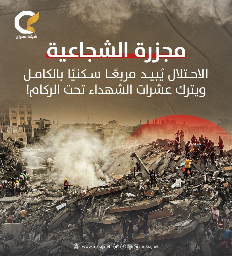 ارتكبت قوات الاحتلال “الإسرائيل]” صباح اليوم الأربعاء، مجزرة وحشية جديدة بعد استهدافها لمربع سكني كامل مكزن من 8 منازل، في حي الشجاعية شرقي مدينة غزة.