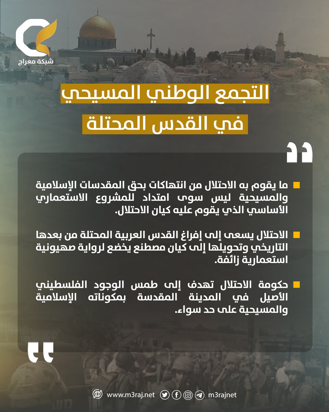 أدان التجمع الوطني المسيحي في القدس المحتلة ممارسات الاحتلال “الإسرائيلي” بحق المقدسات الإسلامية والمسيحية، مؤكداً أنها امتداد للمشروع الاستعماري الذي أُسس عليه كيان الاحتلال.