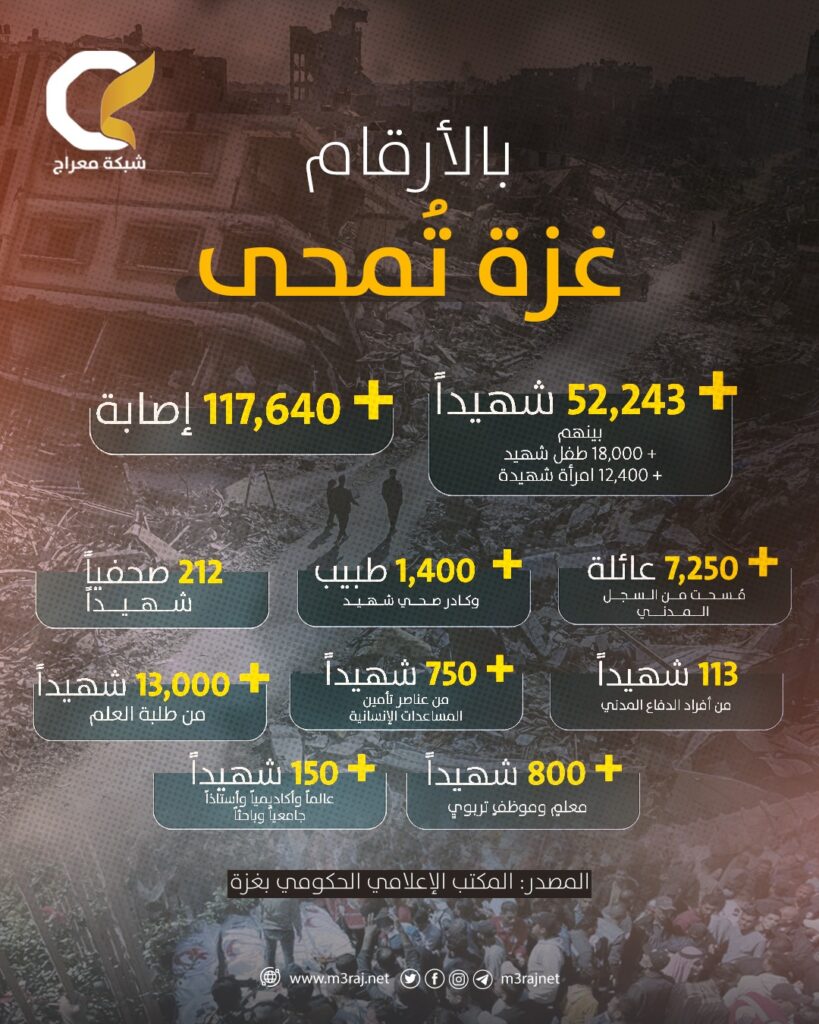 ولفت المكتب إلى أن حملة القتل طالت أيضاً أكثر من 13,000 طالب وطالبة، بالإضافة إلى أكثر من 800 معلم وموظف تربوي، فضلاً عن أكثر من 150 عالماً وأكاديمياً وباحثاً، إضافة إلى آلاف الموظفين والعاملين في القطاعات المدنية المختلفة بقطاع غزة.