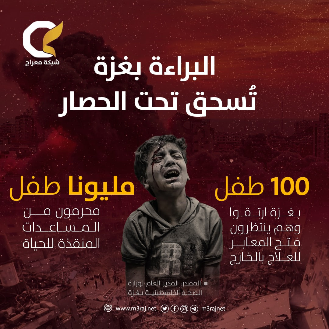 أرقام مروعة تكشف تفاقم معاناة الأطفال في غزة جراء الحصار والعدوان المستمر، في ظل عدم فتح المعابر لتقديم العلاج، يعاني الأطفال من جوع وأمراض تتسبب في وفاتهم بشكل بطيء، في حين يُحرم ملايين آخرون من المساعدات المنقذة للحياة.