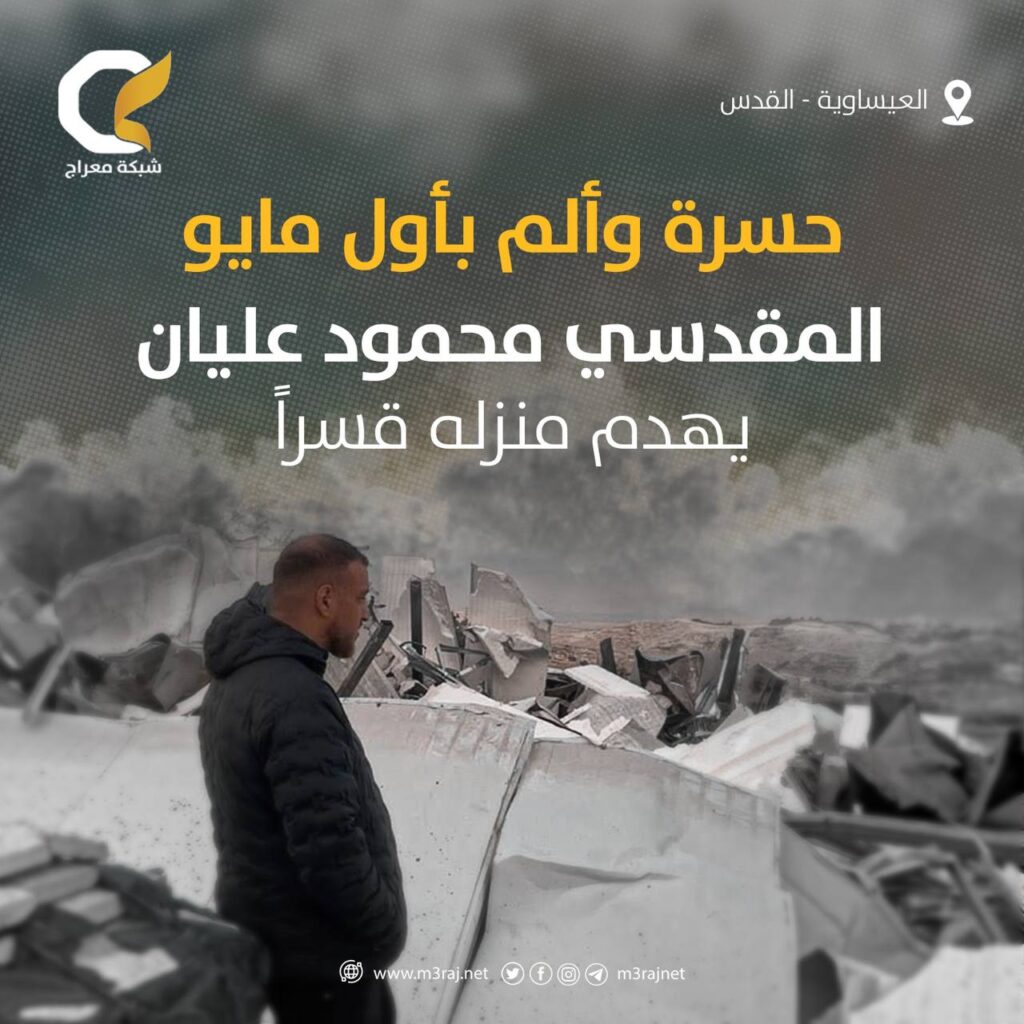 هدم المقدسي محمود عليان منزله ذاتيًا في بلدة العيساوية شمال شرقي القدس المحتلة، مع مطلع شهر مايو، بعدما أجبرته بلدية الاحتلال “الإسرائيلي” على تنفيذ القرار بذريعة البناء دون ترخيص.