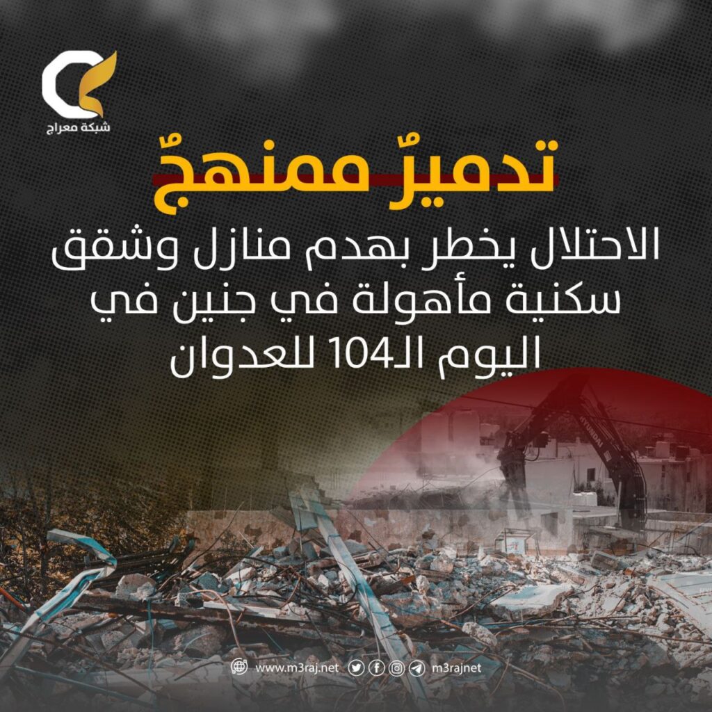 أخطرت قوات الاحتلال “الإسرائيلي” بإخلاء عمارة سكنية تحوي 12 شقةو أربعة منازل مستقلة في حي الزهراء بمحيط مخيم جنين، وإعطائهم مهلة من نصف ساعة إلى يومين للإخلاء بنية الهدم.