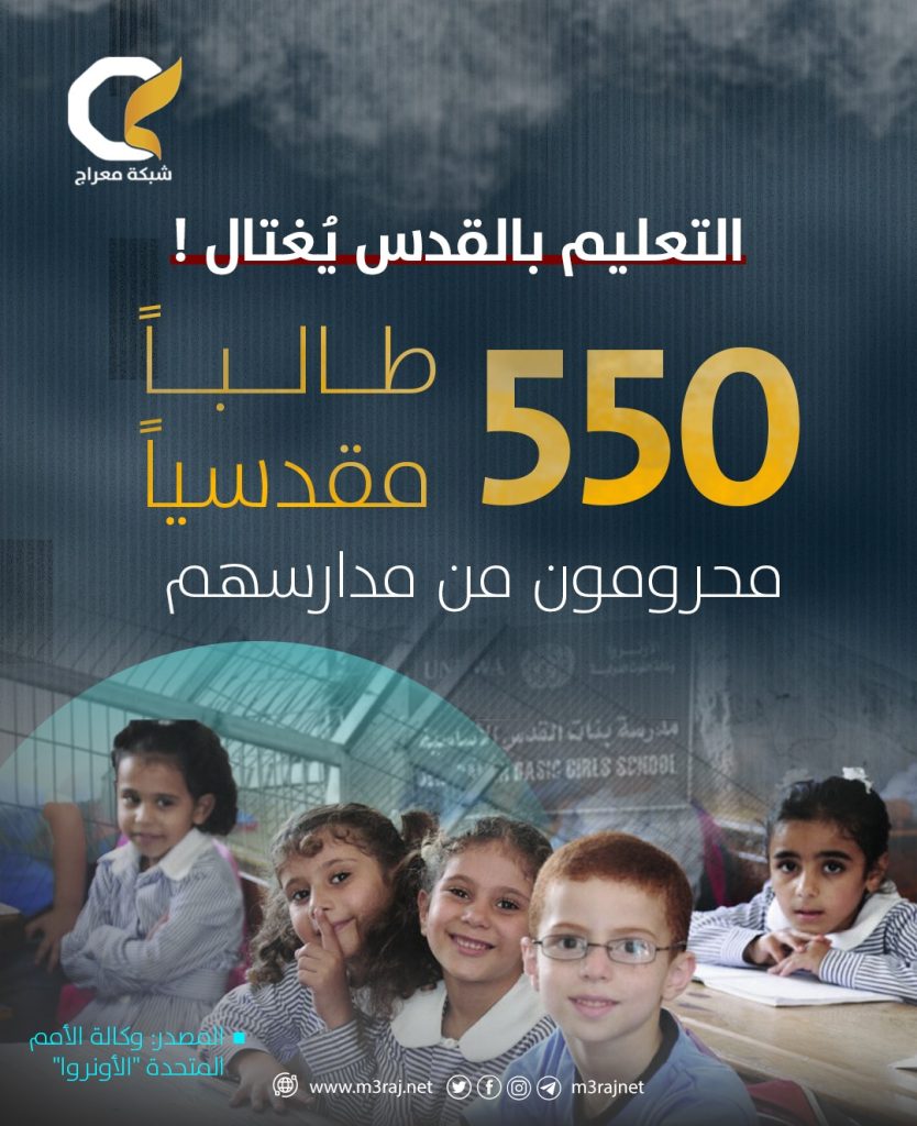 أفادت وكالة الأمم المتحدة لغوث وتشغيل اللاجئين الفلسطينيين “أونروا” أن سلطات الاحتلال “الإسرائيلي” تمنع 550 طالبًا من الوصول إلى مدارسهم في شرقي مدينة القدس المحتلة.