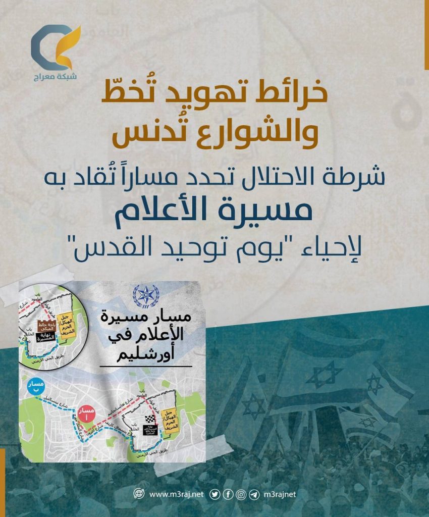 نشرت شرطة الاحتلال “الإسرائيلي” خريطة مسار “مسيرة الأعلام” التهويدية المقررة عصر الاثنين المقبل، 26 مايو، ضمن فعاليات ما يسمى بيوم “توحيد القدس”، وذلك في إطار استعداداتها لتأمين اقتحامات المستوطنين.
