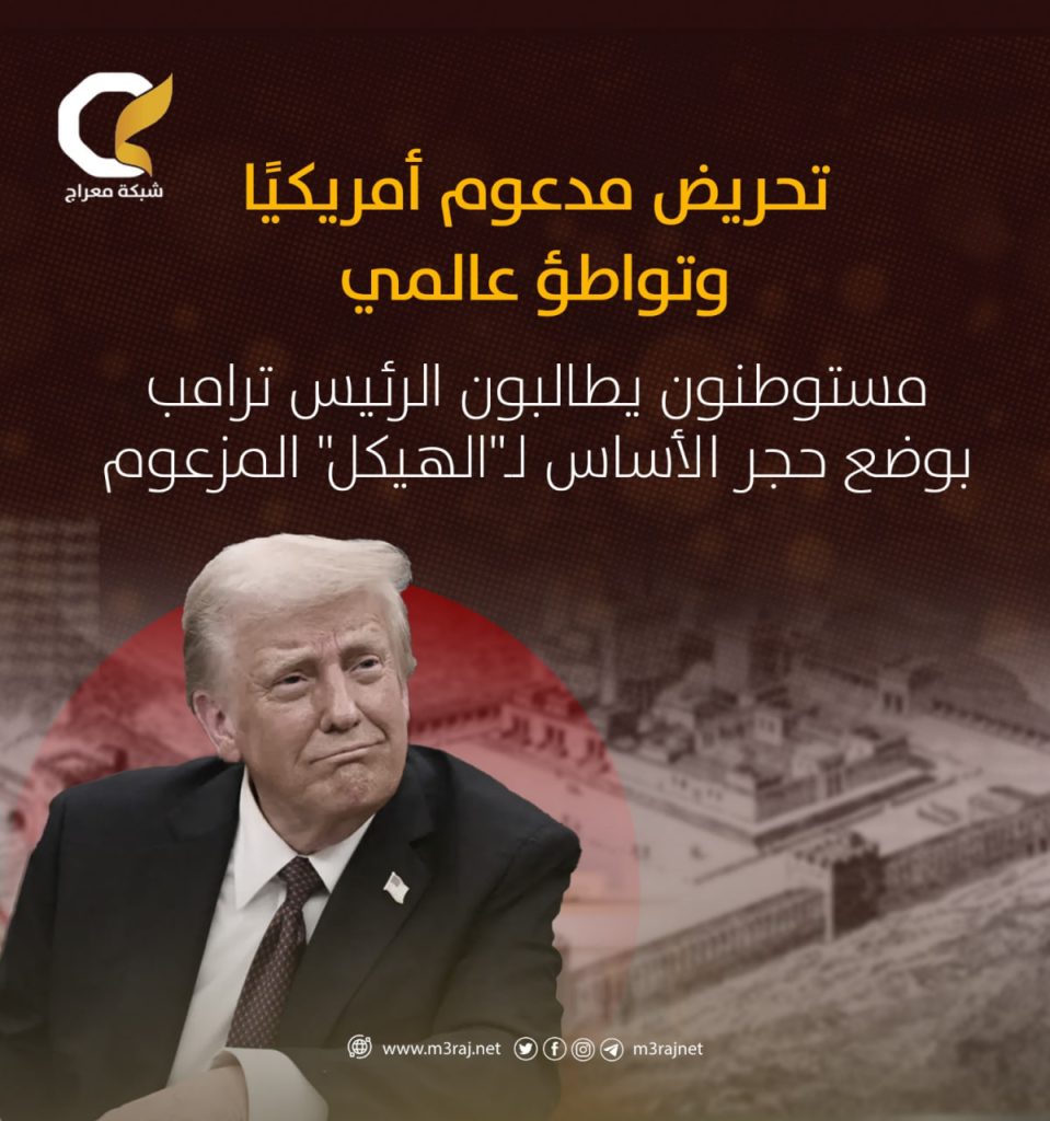 طالبَت الجماعات المتطرفة الرئيس الأمريكي دونالد ترامب بوضع حجر الأساس لما يسمونه “الهيكل المزعوم” داخل الحرم القدسي، في إطار حملات تحريض متواصلة ضد المسجد الأقصى المبارك.