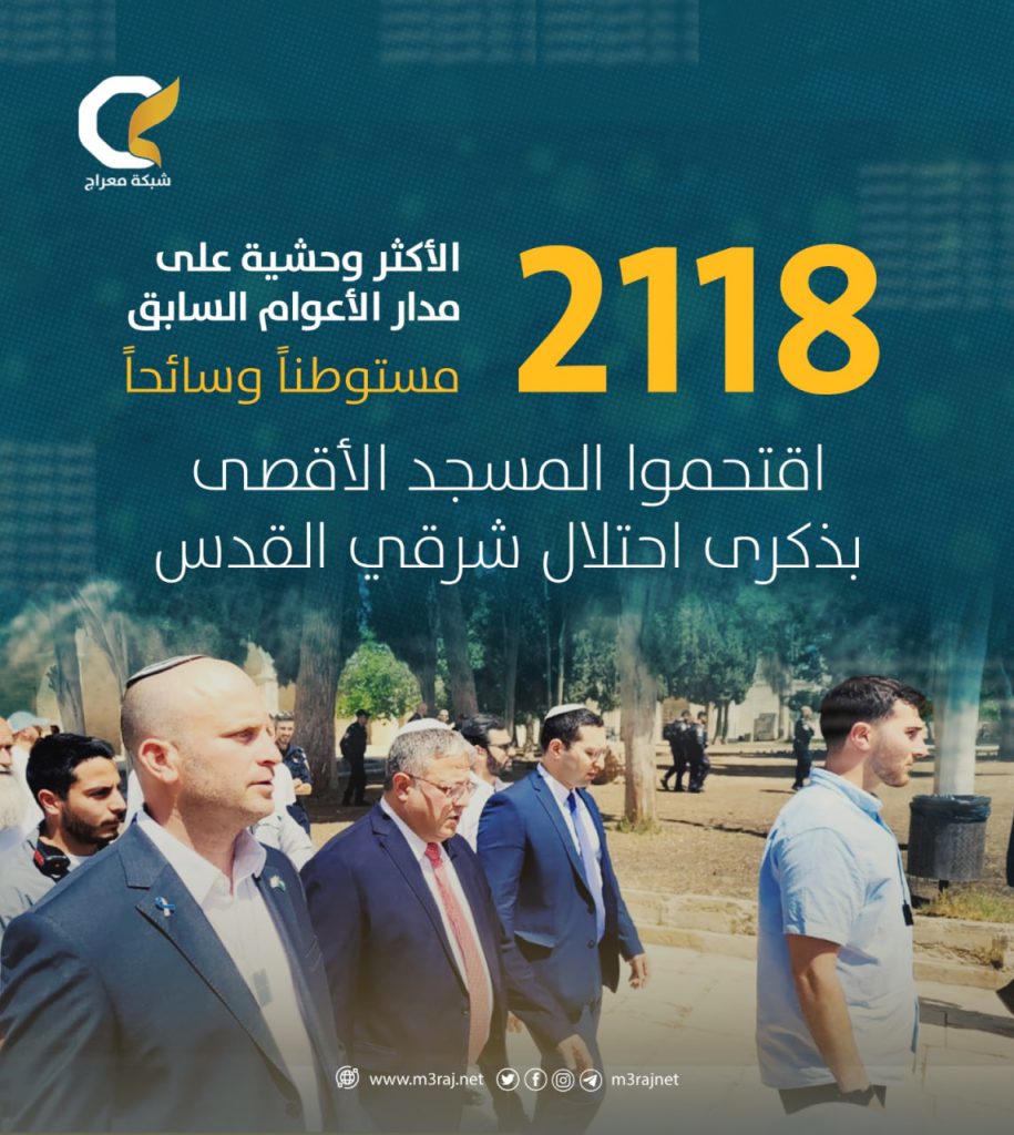 دنّس أكثر من 2118 مستوطنًا ومقتحماً تحت غطاء السياحة المسجد الأقصى المبارك اليوم الإثنين، في أكبر اقتحام خلال السنوات الماضية، لإحياء ما يسمى “يوم توحيد القدس”.