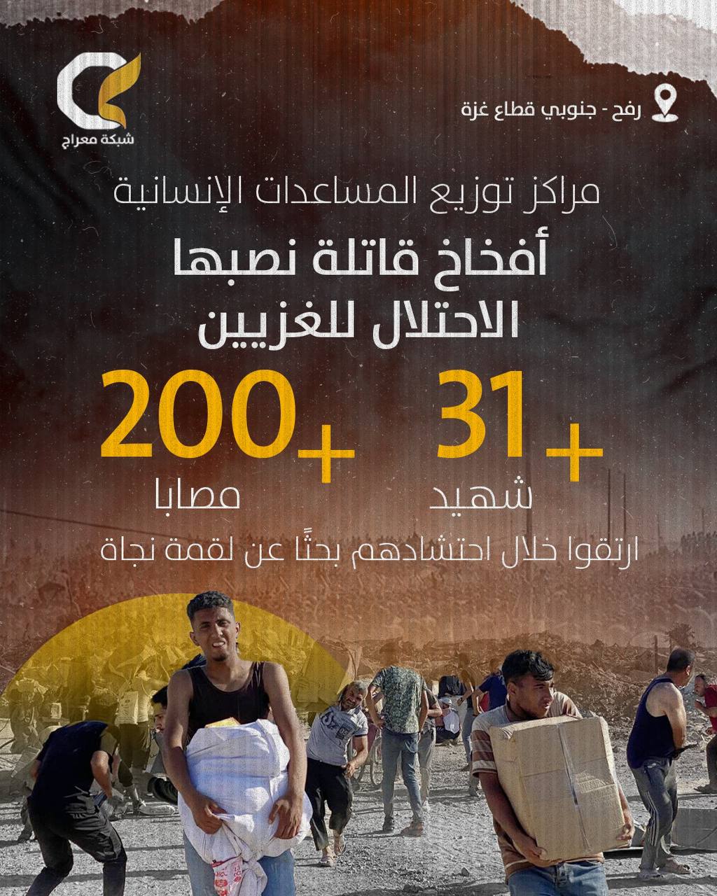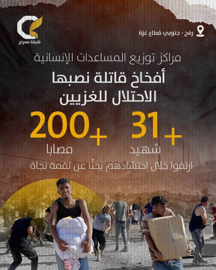 ارتكب الاحتلال “الإسرائيلي” أمس الأحد، مجزرة مروعة بعد أن استهدف آلاف المواطنين المحتشدين قرب موقع توزيع المساعدات الأمريكية غرب مدينة رفح، جنوبي قطاع غزة.