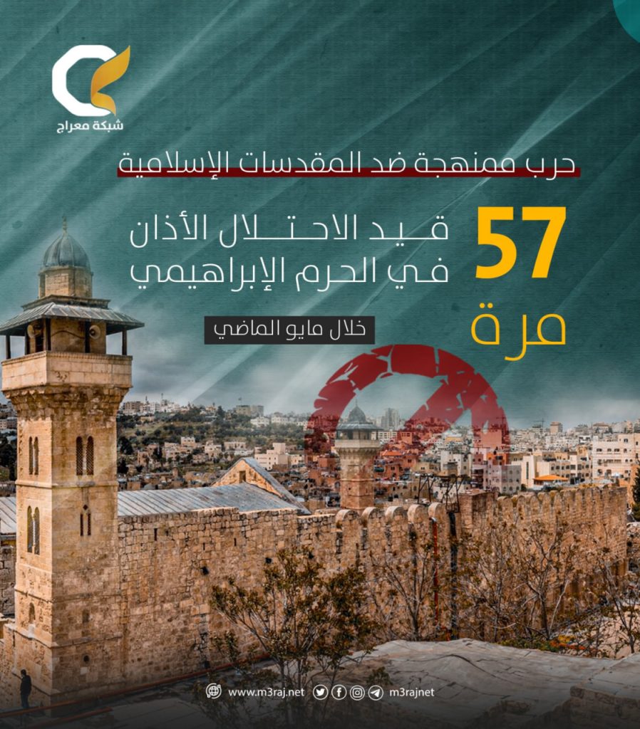 ففي شهر أيار/مايو الماضي، منعت سلطات الاحتلال رفع الأذان في المسجد الإبراهيمي الشريف بمدينة الخليل 57 مرة، في تصعيد واضح ضد المقدسات الإسلامية.
