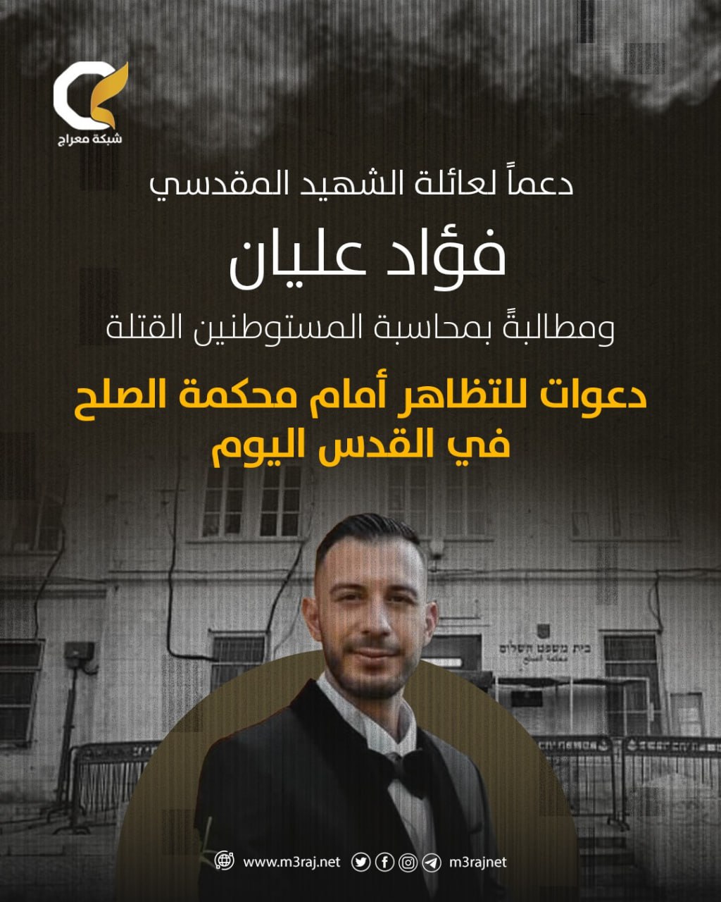 دعوات واسعة للتظاهر أمام محكمة الصلح في مدينة القدس، دعماً لعائلة الشهيد المقدسي فؤاد عليان من بلدة بيت صفافا، ومطالبةً بمحاسبة المستوطنين المتورطين في جريمة قتله.