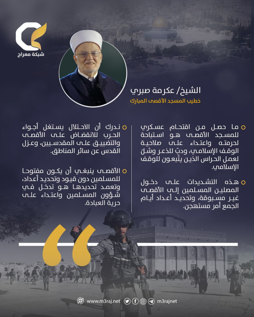 أكد خطيب المسجد الأقصى المبارك، الشيخ عكرمة صبري، أن الاقتحام العسكري الذي نفذته قوات الاحتلال “الإسرائيلي” داخل المسجد الأقصى يُعدّ استباحة لحرمته واعتداءً صارخًا على صلاحيات الوقف الإسلامي، كما تسبب في بث الذعر وشلّ عمل الحراس التابعين له.