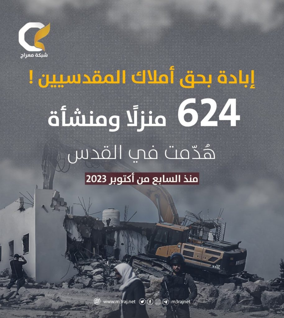 نفّذ الاحتلال “الإسرائيلي” منذ السابع من أكتوبر 2023 حملة هدم واسعة طالت 623 منزلًا ومنشأة في مدينة القدس المحتلة، شملت منازل سكنية مأهولة وأخرى قيد الإنشاء، إضافة إلى منشآت تجارية تُعد مصدر رزق لعشرات العائلات المقدسية.