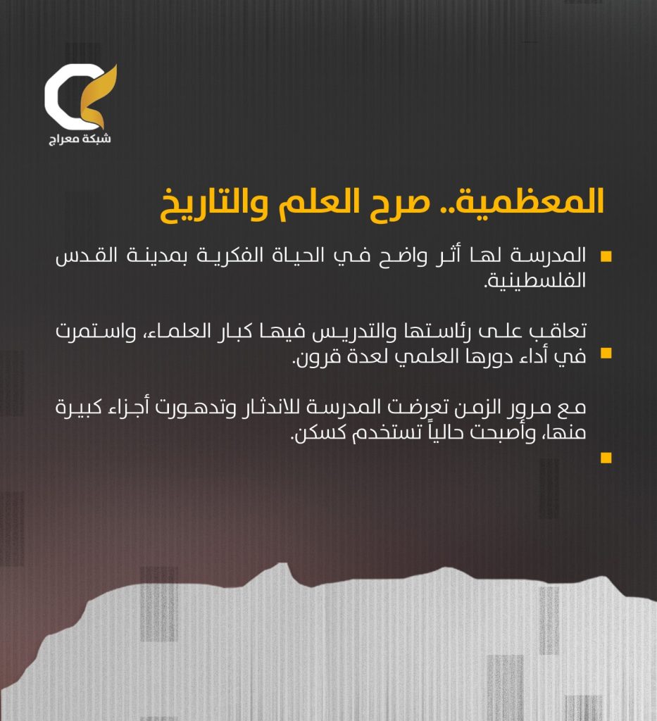 تُعتبر المدرسة المعظمية، المعروفة أيضاً بالحنفية، من أبرز المؤسسات التعليمية الدينية في القدس المحتلة، حيث تعتمد هذه المدرسة على أوقاف متعددة أُنشئت لها من قبل جهات مختلفة، مما يضمن استمرارية عملها ودورها، كما لعبت المعظمية دورًا بارزًا في تعزيز الحياة الفكرية والدينية في المدينة الفلسطينية المقدسة، مساهِمةً في تشكيل الوعي الثقافي والديني لأجيال المقدسيين.