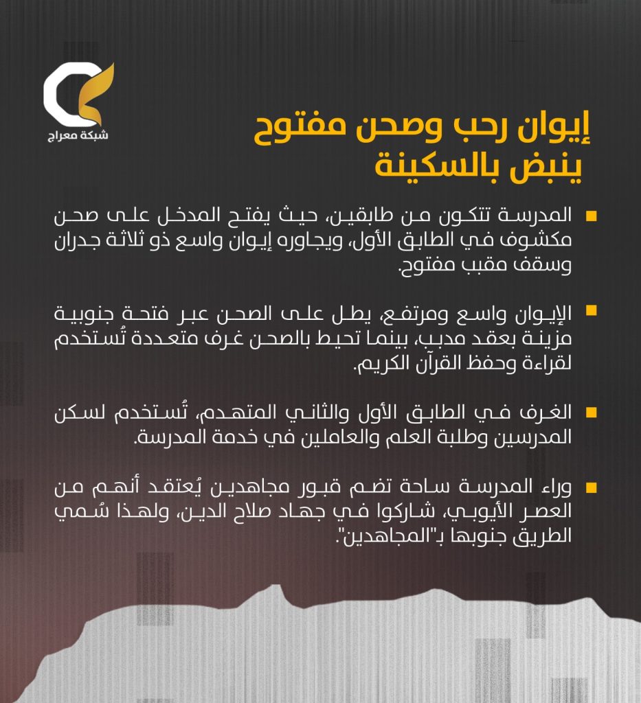 وراء المدرسة ساحة تضم قبور مجاهدين يُعتقد أنهم من العصر الأيوبي، شاركوا في جهاد صلاح الدين، ولهذا سُمي الطريق جنوبها بـ”المجاهدين”.