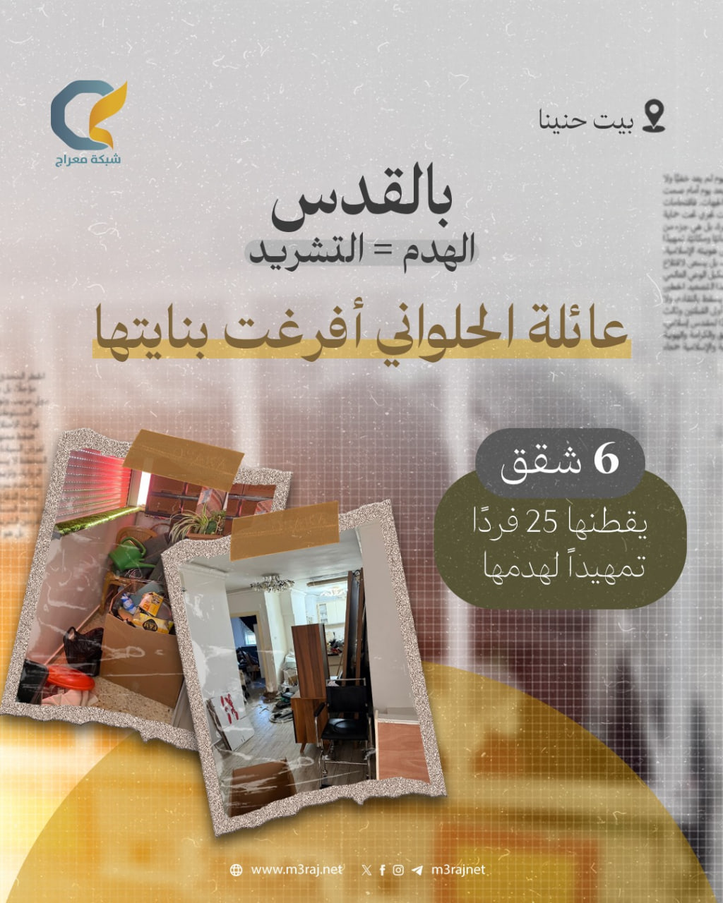 أجبرت بلدية الاحتلال “الإسرائيلي”، عائلة الحلواني المقدسية على إخلاء بنايتها السكنية في بلدة بيت حنينا بالقدس المحتلة، تمهيدًا لهدمها.