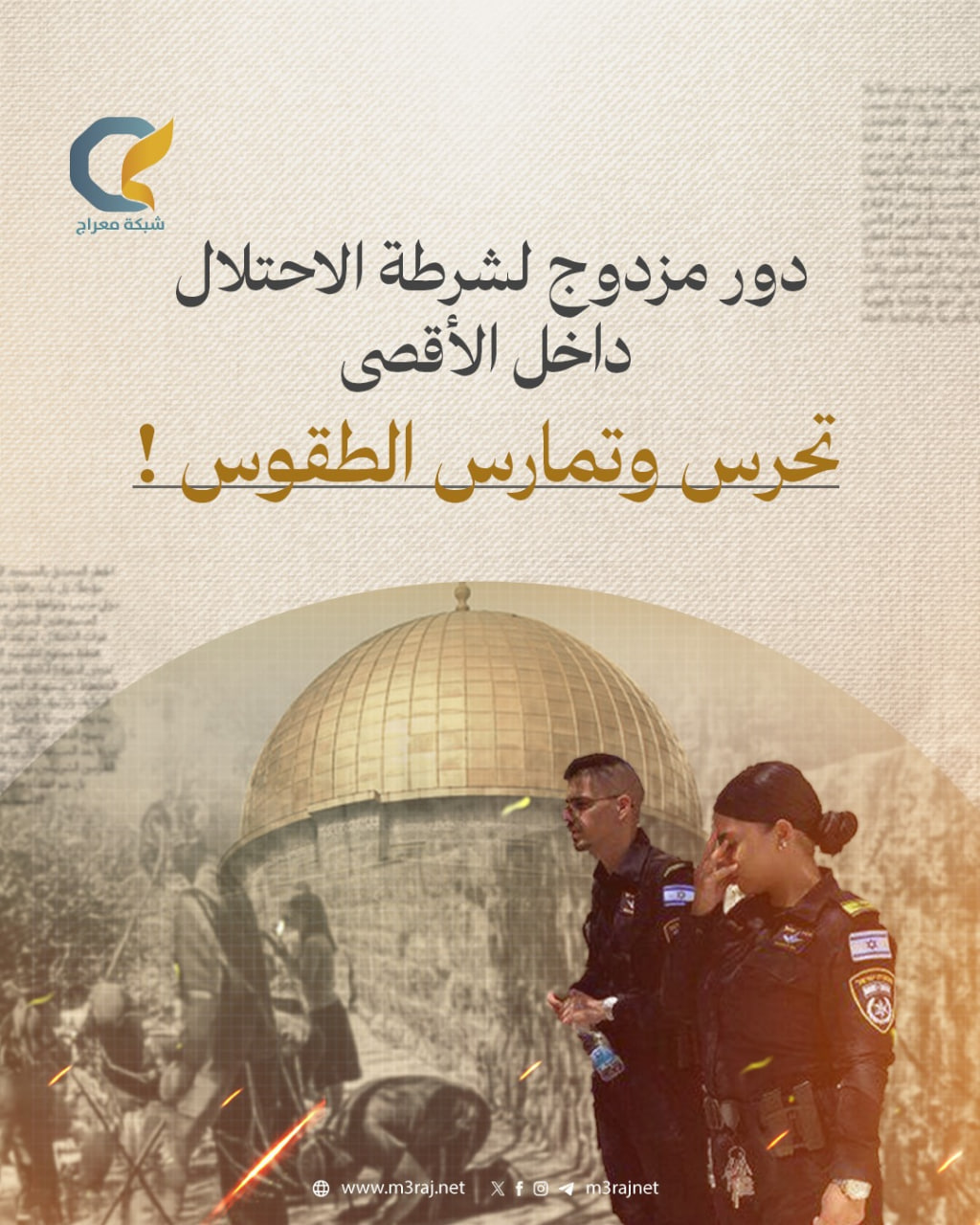 وكشفت الصورة عن تطور لافت، حيث لم تكتفِ شرطة الاحتلال بدورها المعتاد في تأمين اقتحامات المستوطنين وحمايتهم خلال جولاتهم الاستفزازية، بل شارك بعض عناصرها فعلياً في أداء الطقوس، ما يجعلها تؤدي وظيفتين: الحراسة والمشاركة في الانتهاك.