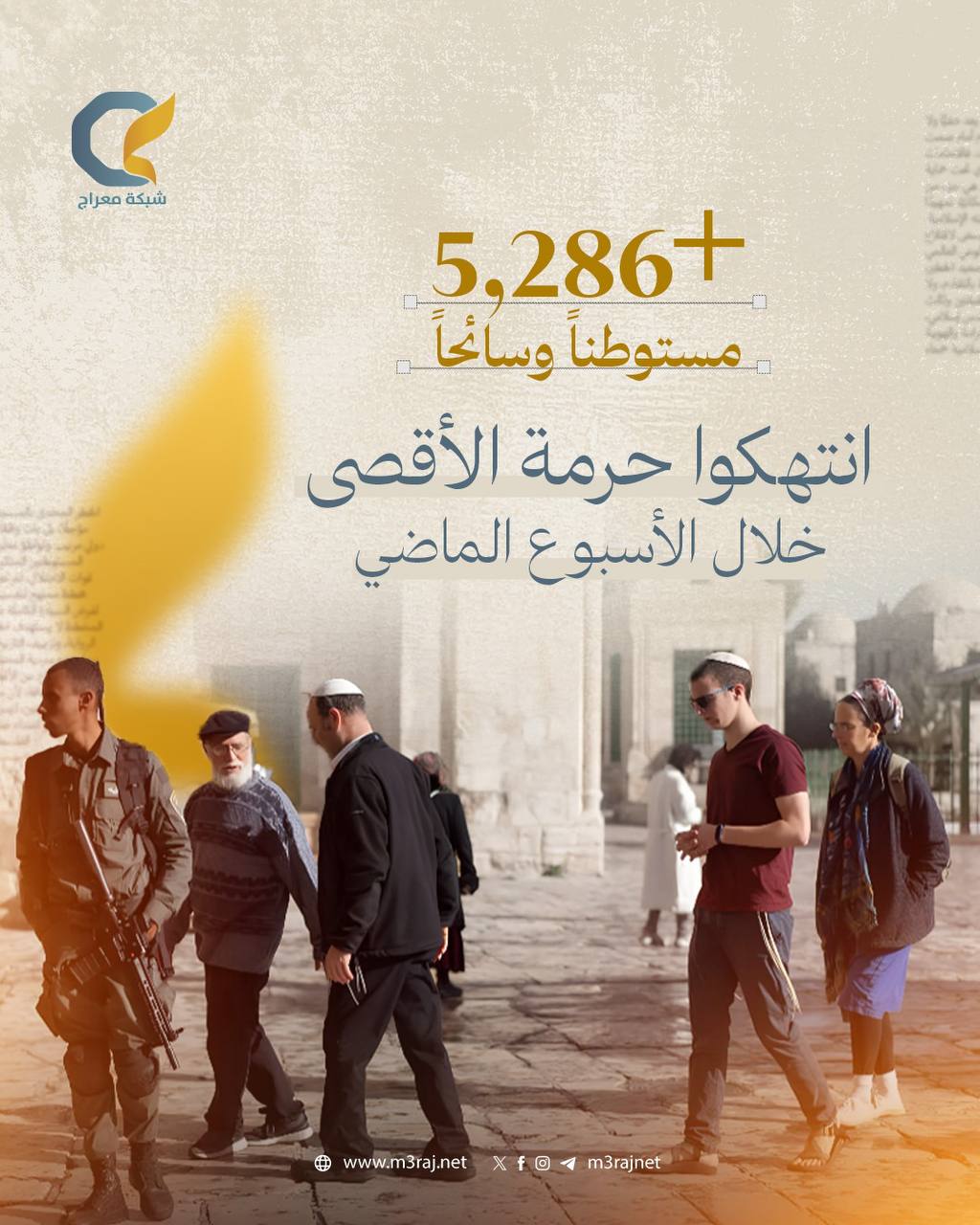 وتجاوز عدد المستوطنين المتطرفين والمقتحمين تحت ذريعة السياحة الذين انتهكوا حرمة المسجد الأقصى المبارك 5,286، حيث نظموا جولات استفزازية وأدوا طقوسهم التلمودية داخل باحاته.