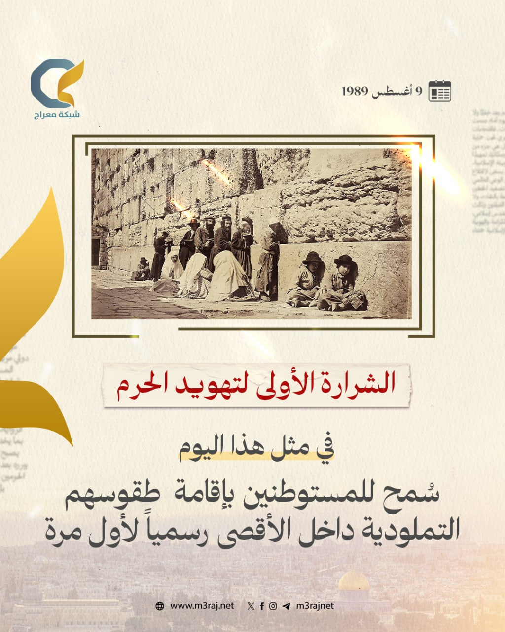 في مثل هذا اليوم عام 1989، سمحت سلطات الاحتلال “الإسرائيلي” للمستوطنين لأول مرة رسميًا بإقامة طقوسهم التلمودية داخل المسجد الأقصى المبارك، مما شكّل انتهاكًا صارخًا للقدسية التاريخية للمكان، هذه الخطوة أطلقت شرارة تصعيد جديد في محاولات فرض السيطرة على المسجد ومحيطه.