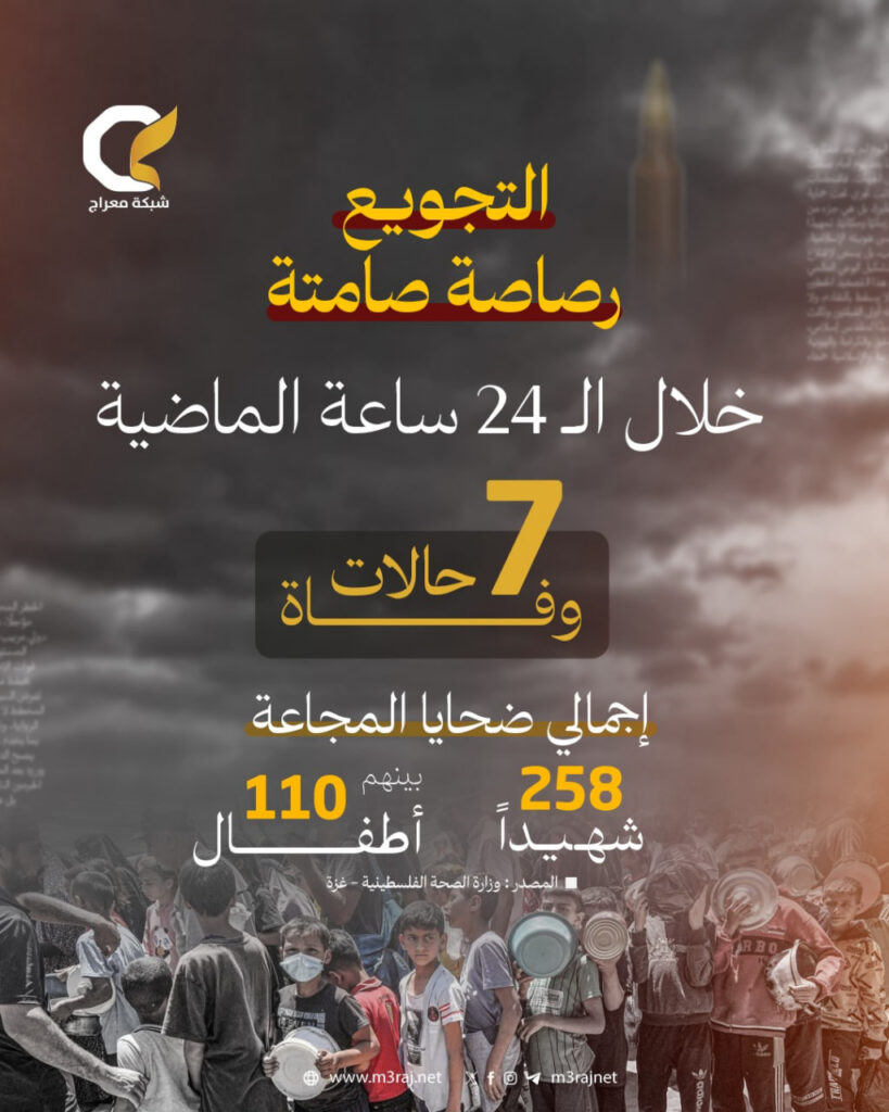 أعلنت وزارة الصحة الفلسطينية في غزة اليوم، تسجيل 7 حالات وفاة في القطاع خلال الـ24 ساعة الماضية، نتيجة سوء التغذية، من بينهم طفلان.
