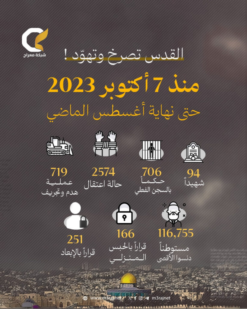 ومنذ 7 أكتوبر 2023، سجلت الأرقام المأساوية: 94 شهيداً، 706 أحكام بالسجن الفعلي ضد المقدسيين، 2574 حالة اعتقال، 719 عملية هدم وتجريف لمنازل ومنشآت، 116,755 مستوطناً دنّسوا المسجد الأقصى، إلى جانب 166 قراراً بالحبس المنزلي و251 قراراً بالإبعاد، في مؤشر واضح على مشروع ممنهج لتفريغ القدس من أهلها.