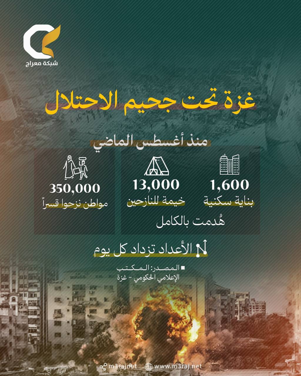 وأشار المكتب إلى أن الاحتلال دمّر 1,600 بناية سكنية و13,000 خيمة، مُهجّرًا قسريًا نحو 350,000 مواطن من شرق المدينة إلى وسطها وغربها.