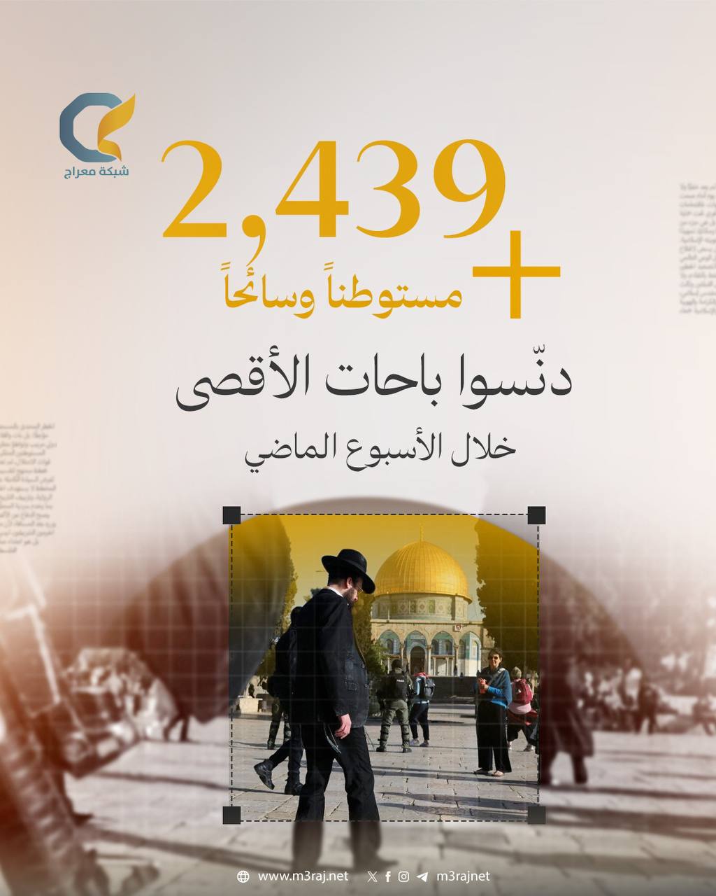 بحسب مصادر محلية، بلغ عدد المقتحمين المتطرفين خلال الأسبوع أكثر من 2439 مستوطنًا ومقتحماً تحت غطاء السياحة، حيث نظموا جولات استفزازية وأدوا طقوسهم التلمودية في باحاته.