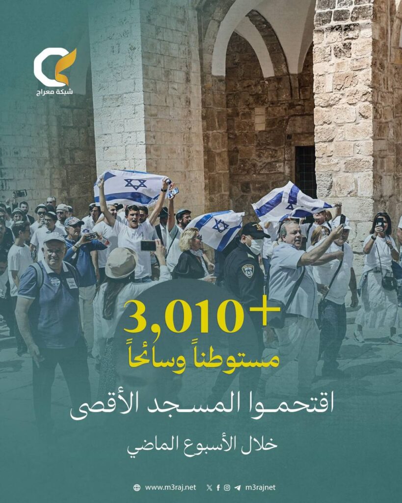 وبحسب مصادر محلية، بلغ عدد المقتحمين المتطرفين خلال الأسبوع أكثر من 3010 مستوطنًا ومقتحماً تحت غطاء السياحة، حيث نظموا جولات استفزازية وأدوا طقوسهم التلمودية في باحاته.