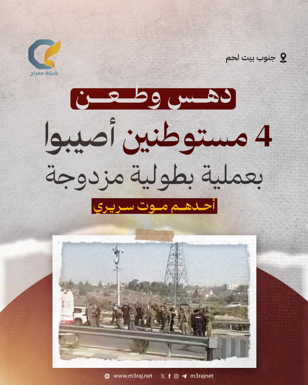 أعلنت مصادر طبيّة إسرائيلية، عصر يوم الثلاثا، إصابة أربعة مستوطنين بجراحٍ متفاوتة بعد عملية دهس وطعن نفّذها فلسطينيان عند مفرق تجمع مستوطنات “غوش عتصيون” جنوبي بيت لحم بالضفة الغربية المحتلة.