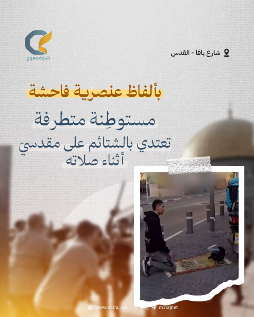 اعتدت مستوطنة متطرفة على شاب مقدسي بألفاظ عنصرية وبذيئة أثناء صلاته في حي “محنيه يهودا” التهويدي بشارع يافا في القدس المحتلة.