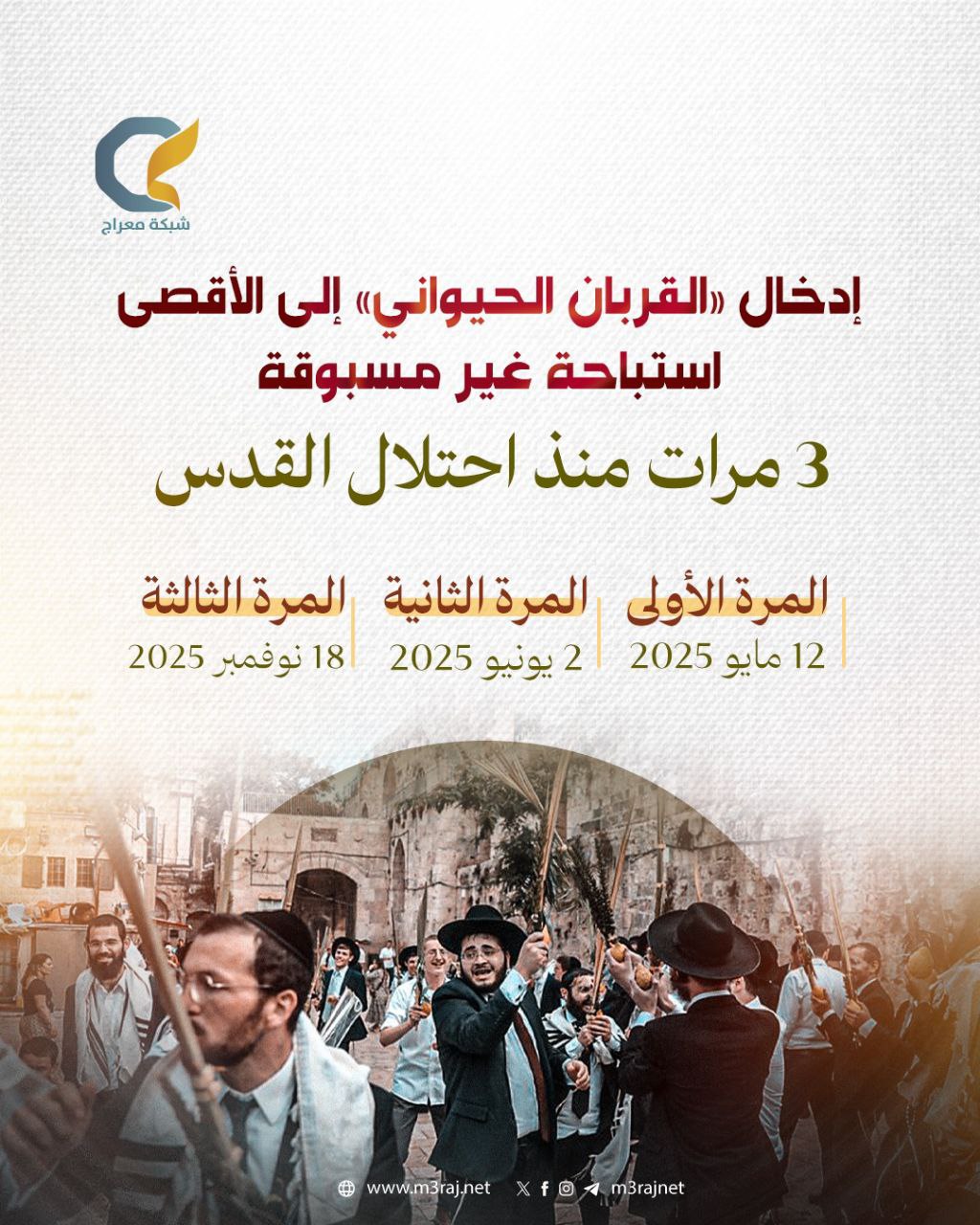 شهد المسجد الأقصى المبارك تصعيدًا خطيرًا، تمثل في محاولات متكررة لإدخال ما يُسمى بـ”القربان الحيواني” إلى باحاته، في استفزاز غير مسبوق لحرمته وقدسيته.